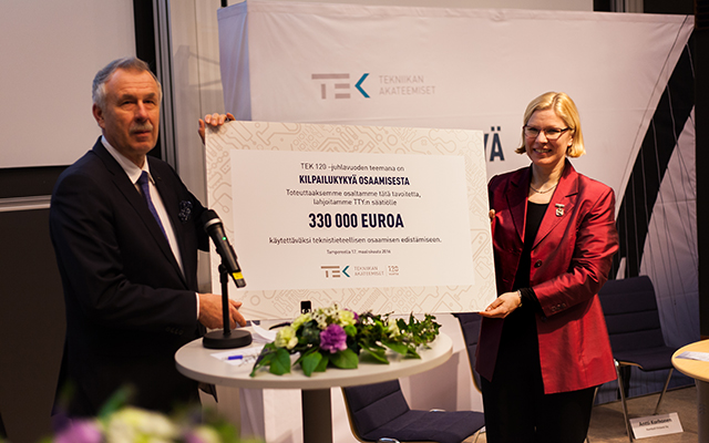 TEK lahjoitti 120-vuotisjuhlaseminaarinsa yhteydessä 330 000 euroa Tampereen teknilliselle yliopistolle. TEKin hallituksen puheenjohtaja Marjo Matikainen-Kallström ojensi lahjoituksen TTY:n rehtorille Markku Kivikoskelle.