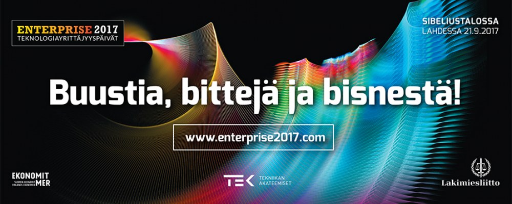 #Enterprise2017 – Teknologiayrittäjyyspäivät tuovat yhteen teknologia-alalla toimivat yrittäjät ja yrittäjyydestä kiinnostuneet. TEK järjestää tapahtuman yhdessä Suomen Ekonomien ja Suomen Lakimiesliiton kanssa.