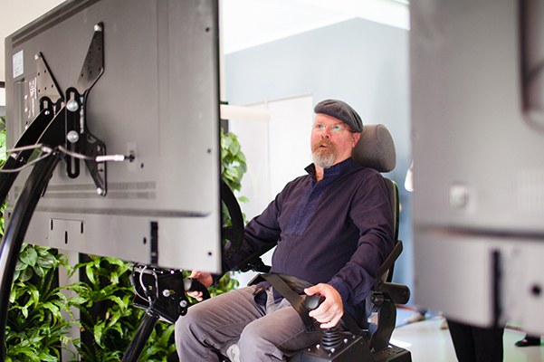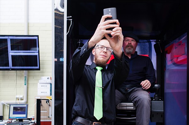 Mitä tiedät simulaattoreista? kysyy simulaattoreita suunnittelevan LUT:n spinoff-yritys Mevean markkinointiasiantuntija Eetu Korpela kaivinkonesimulaattorin äärellä.