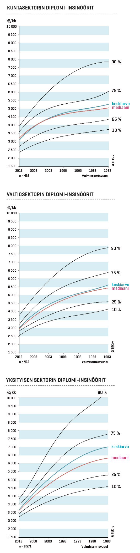 Tavallisesti tekniikan alan vastavalmistuneelle on ehtinyt kertyä 1–2 vuotta työkokemusta kesätöistä ja harjoitteluista, joten nolla ammattivuotta ei tarkoita aivan nollakokemusta. Jos valmistuminen on koulutusta vastaavien töiden vuoksi tapahtunut vuosien viiveellä siitä, kun suurin osa opinnoista oli jo suoritettu, niin nuo työelämässä kuluneet vuodet tulee tietenkin lisätä ammattivuosien määrään. Tällä kertaa vastaajilta ei kysytty opiskeluaikaisen työkokemuksen määrää tai työttömyysjaksojen yhteispituutta, joten niitä ei ole valmiiksi sisällytetty