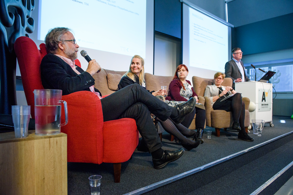 Seminaarin paneelikeskusteluun osallistuivat Aalto-yliopiston vararehtori Eero Eloranta (vas.), yrittäjä ja LUT:n hallituksen vara-pj Laura Lares, SYL:n koulutuspoliittinen vastaava Mia Lehto ja EK:n osaaminen ja kasvu -sektorin johtaja Riikka Heikinheimo. Paneelin juonsi koulutus- ja työvoimapolitiikasta TEKissä vastaava johtaja Jari Jokinen.