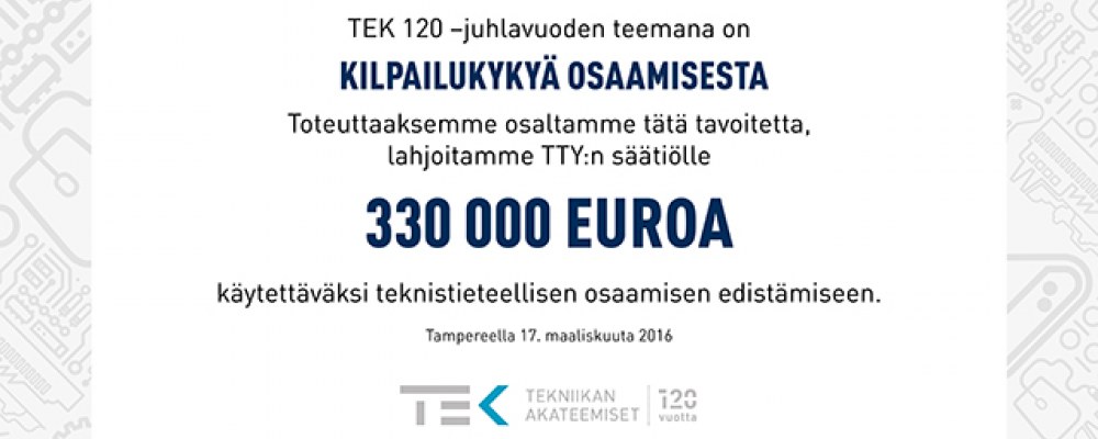 TEK lahjoitti syntymäpäivänään 17.3. Tampereen teknilliselle yliopistolle 330 000 euroa.
