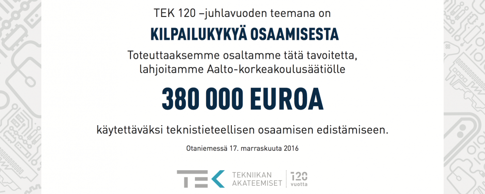 TEKin juhlvuoden lahjoituksista viimeinen, 380 000 euroa, luovutettiin tänään Aalto-yliopistolle järjestön 120-vuotistapahtumassa Otaniemessä. Myös TEKin ruotsinkielinen sisarjärjestö Tekniska Föreningen i Finland (TFiF) teki lahjoituksen Aalto-yliopistolle, 34 000 euroa; järjestöiltä yhteensä siis 414.000 euroa.