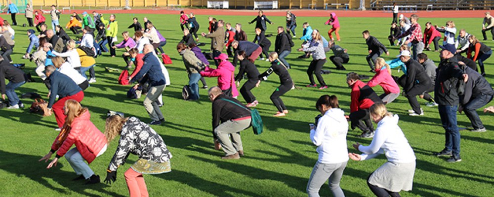 Tilaisuuden alun yhteinen puistojumppa musiikin tahdissa lämmitti sopivasti osallistujia, sillä ilma oli jo syksyisen viileä, vaikkakin aurinkoinen.