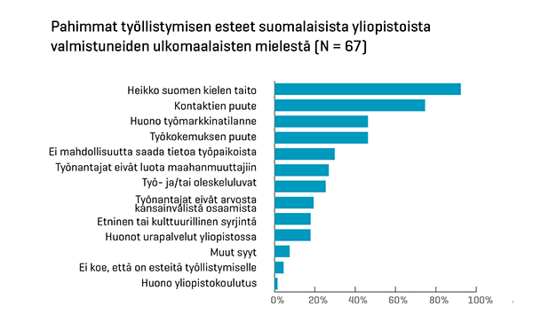 Tutkimukseen vastanneet pitivät omaa taustaansa jo sinänsä esteenä työllistymiselle. Lähes 18 prosenttia piti työllistymisensä esteenä syrjintää, ja noin 27 prosenttia oli sitä mieltä, etteivät työnantajat luota maahanmuuttajiin. Lähes viidennes oli myös sitä mieltä, ettei suomalaisilla työmarkkinoilla arvosteta kansainvälistä osaamista.