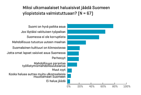 Runsaat 64 prosenttia vastaajista oli tullut Aalto-yliopistoon ilmaisen koulutuksen houkuttelemina, ja kaksi kolmesta oli vielä tutkinnon suoritettuaankin Suomessa. Tänne jääneistä liki 67 prosenttia oli töissä, 44 prosenttia oli päätynyt jatko-opiskelijoiksi, ja joka kymmenes oli jäänyt työttömäksi.